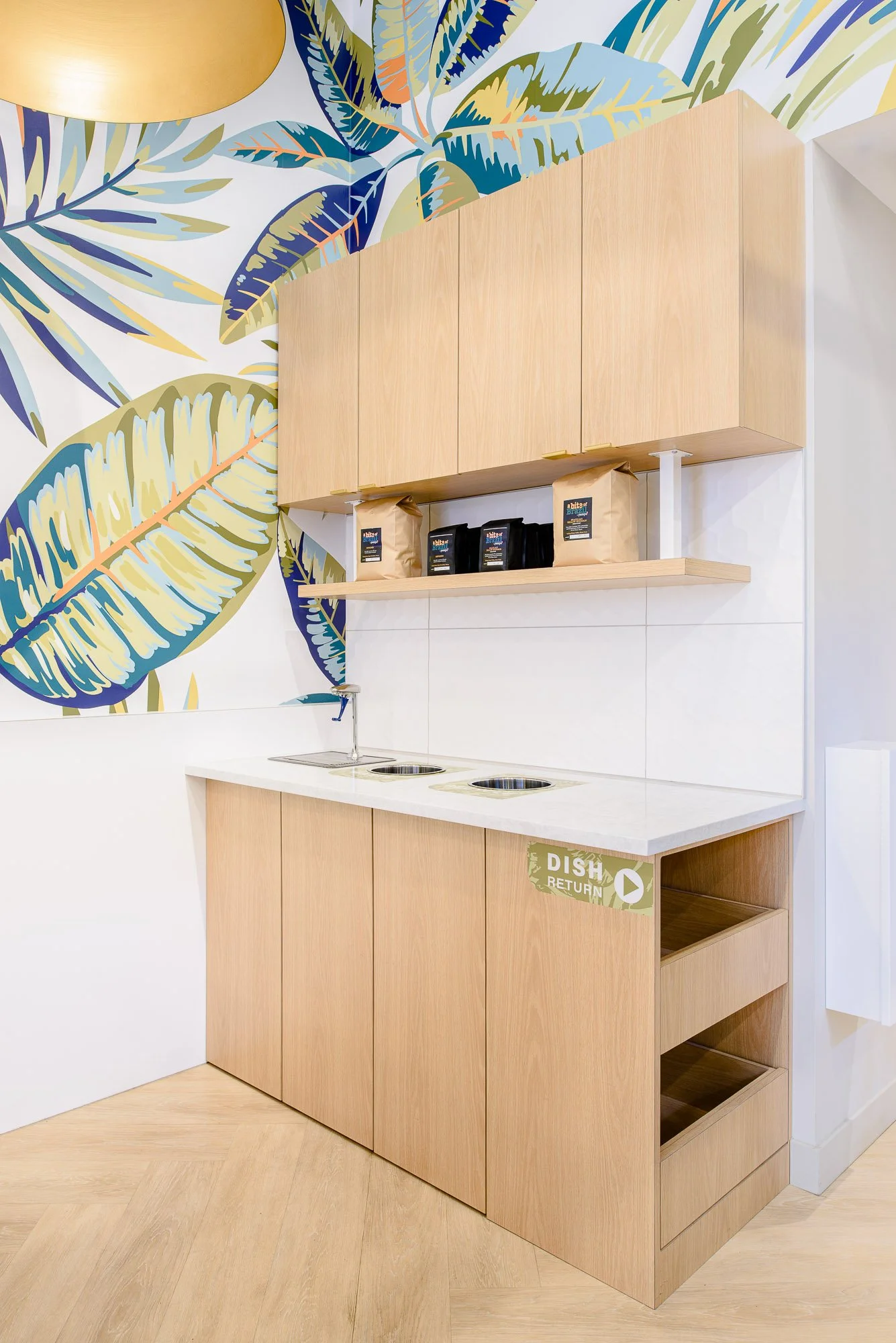 Before we came in, the company had very little brand identity so we knew the interior space would set the tone for the entire customer experience. The colours and shapes of the custom wallcovering have become key elements of the company’s brand, and their social media images are instantly recognizable. The interior palette has informed decisions about uniforms, dishware and packaging, and other marketing efforts.